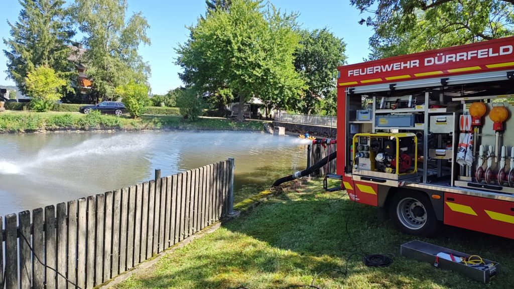Neben dem Wasser umwälzen durch unsere Tragkraftspritze und Tauchpumpe konnten wir zusätzlich den bereits in den See eingebrachten Schaufelradbelüfter über unseren Stromerzeuger betreiben, bis die Stromversorgung zum See hergestellt wurde.
